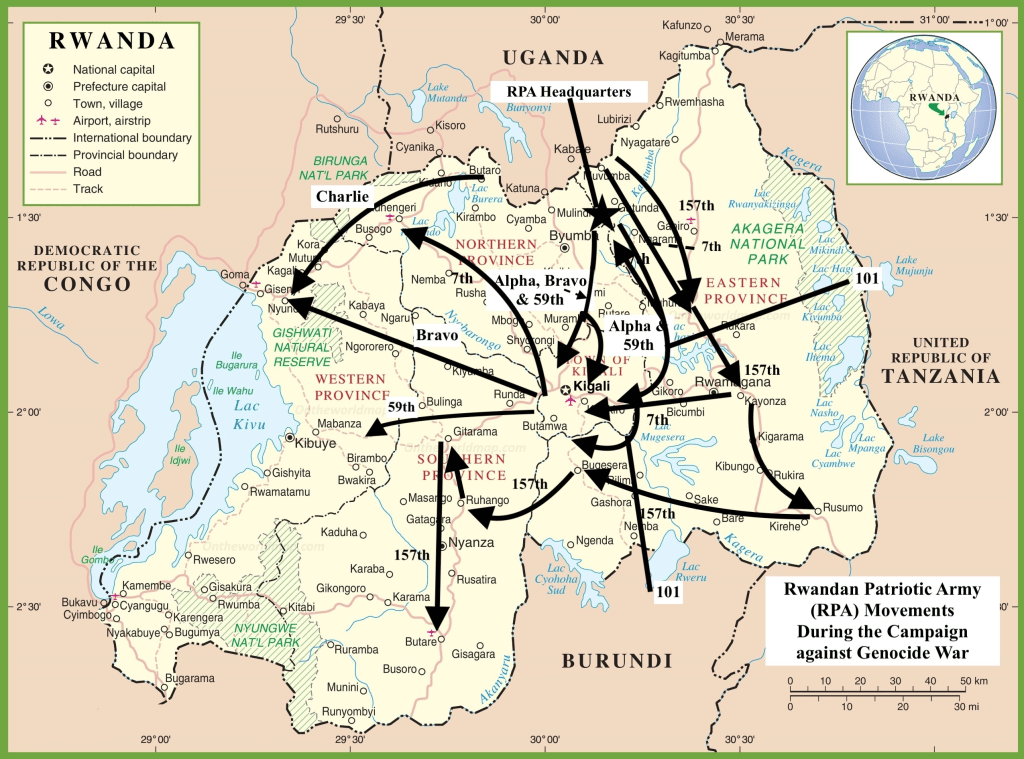 On the night of April 6th, 1994, Rwandan President Juvenal Habyarimana’s Presidential Plane was shot down while approaching Kigali International Airport. The President’s death, along with other top Rwandan officials and Burundi’s President Cyprien Ntaryamira, ignited the Genocide against the Tutsi (also known outside of Rwanda as the Rwandan Genocide). Within 100 days, the nation witnessed up to a million Tutsi and non-extremist Hutu deaths by Hutu extremists. The targeted killing of Rwanda’s Tutsis only ended when the Rwandan Patriotic Army (RPA), the military wing of the Rwandan Patriotic Front (RPF), defeated the genocide forces. While Kigali’s liberation was on July 4th, it would take several weeks (Gisenyi was taken by July 18th, but Opération Turquoise prevented RPA from taking control of southwestern Rwanda until August 21st) for the rest of the country.